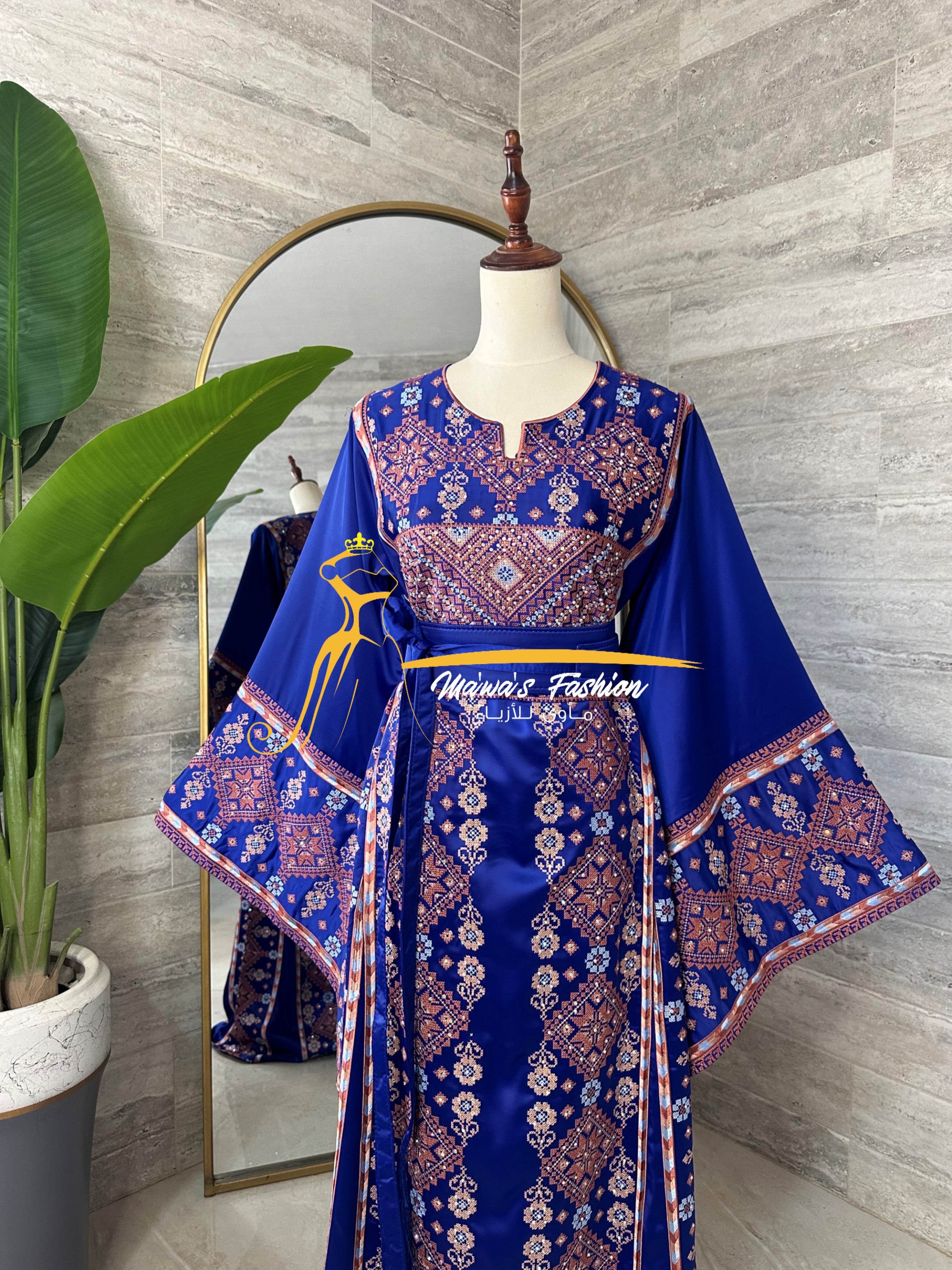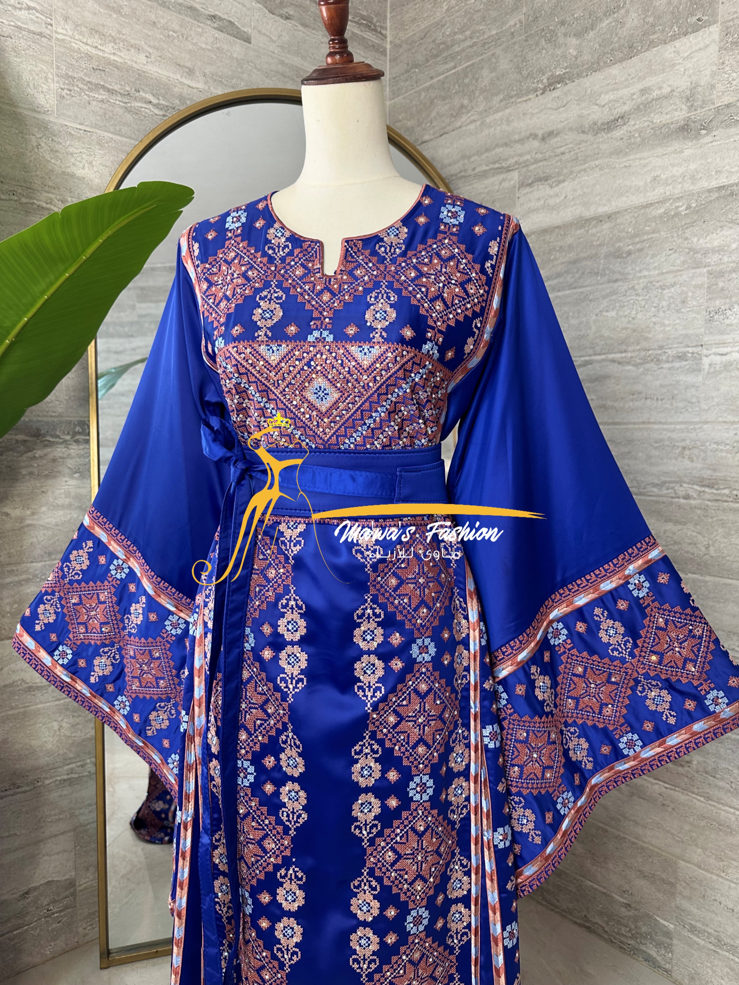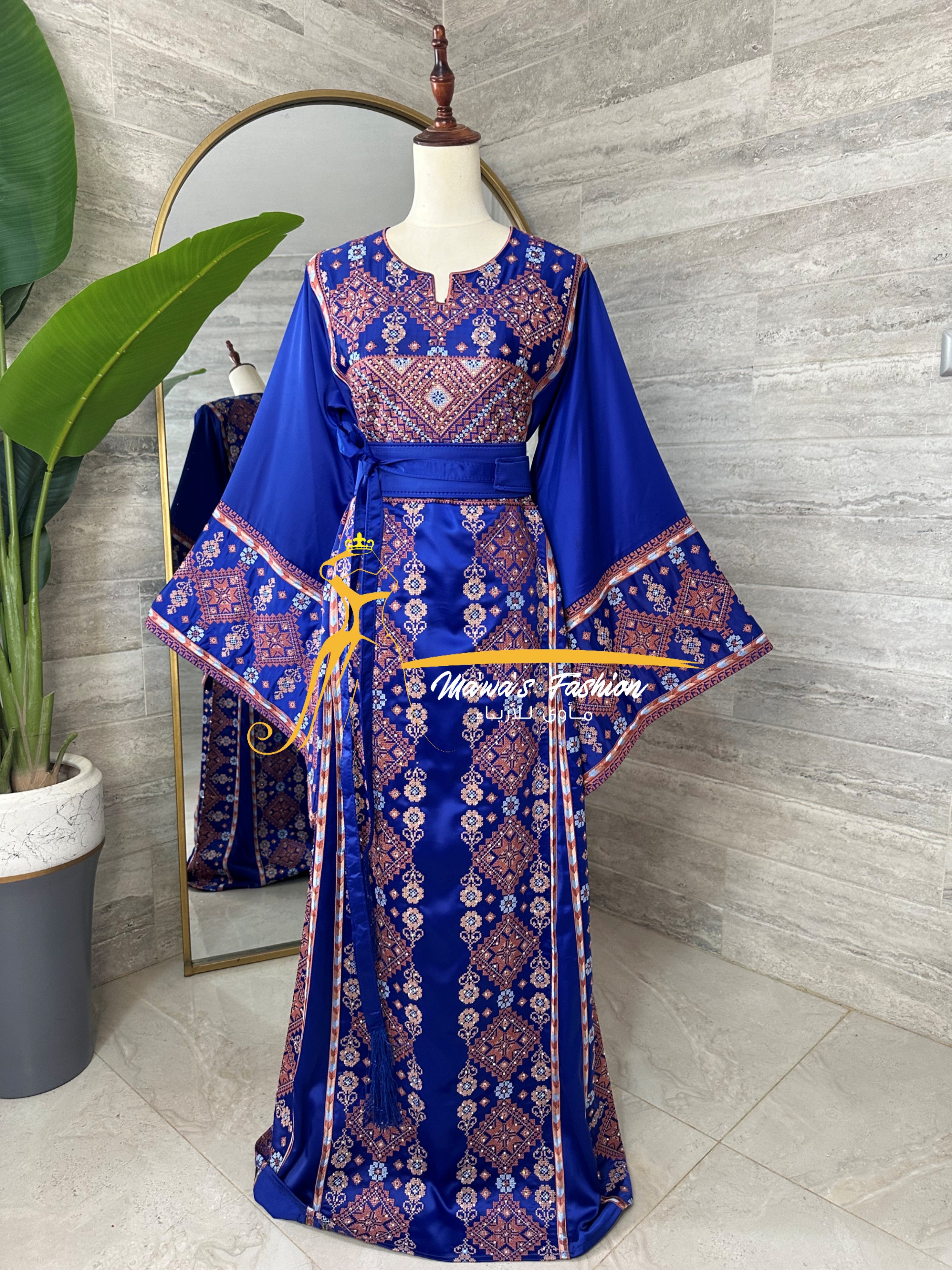 ثوب تراثي بلمسة عصرية بالوان راقية مع تطريز ثقيل من الأمام والخلف تزيد الثوب بهجة، بقماشة الستان ليضيف  على الثوب رقي.