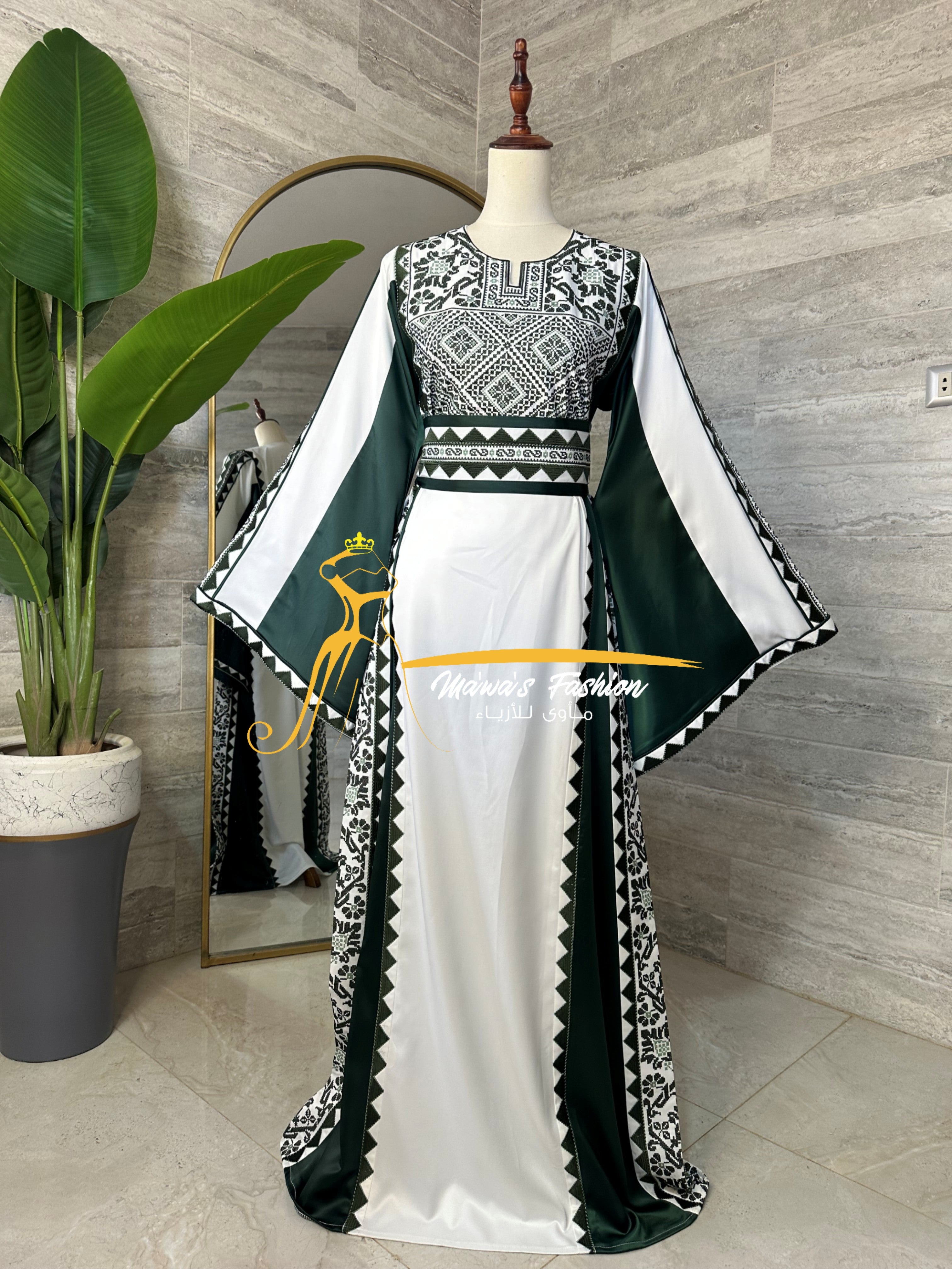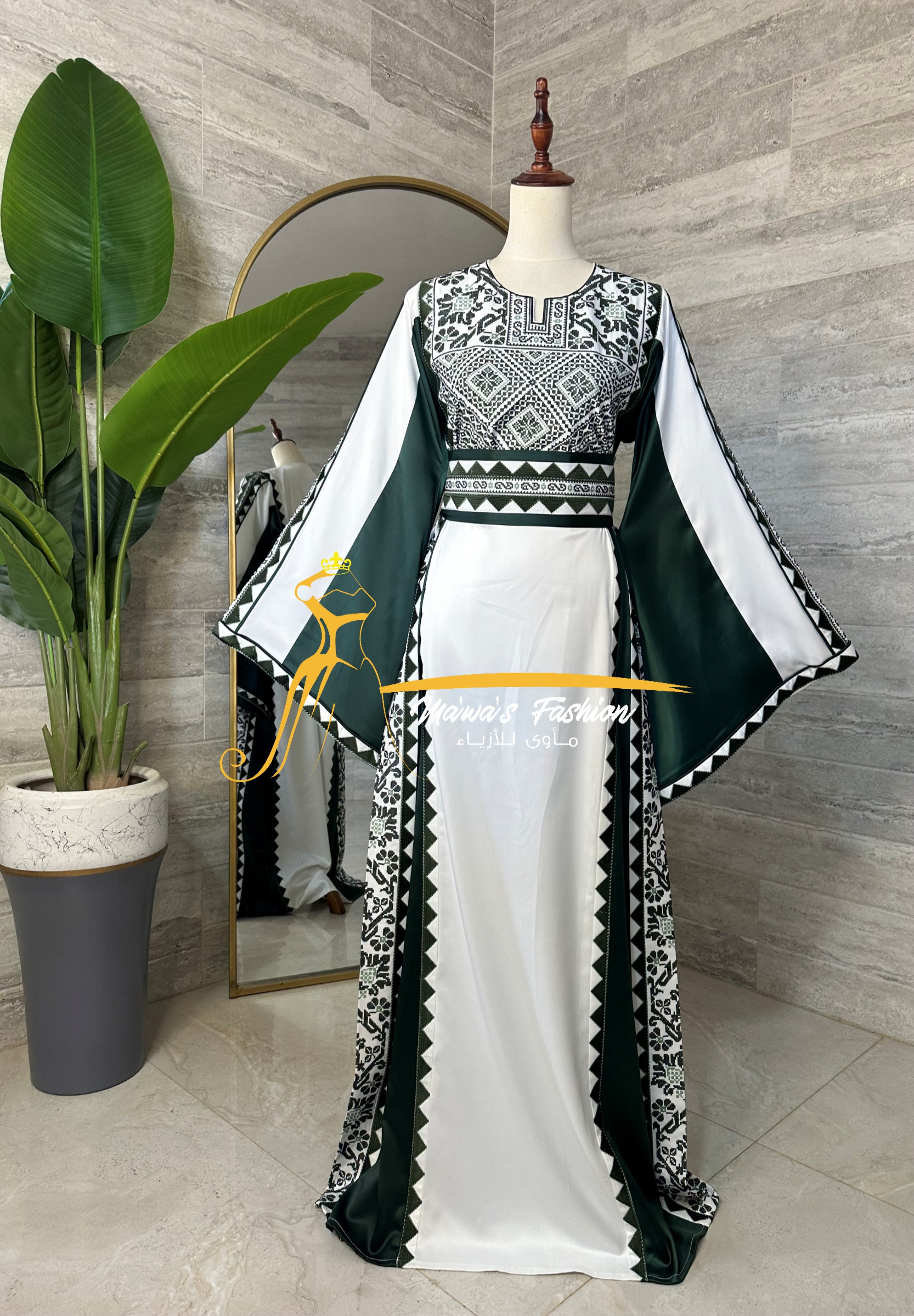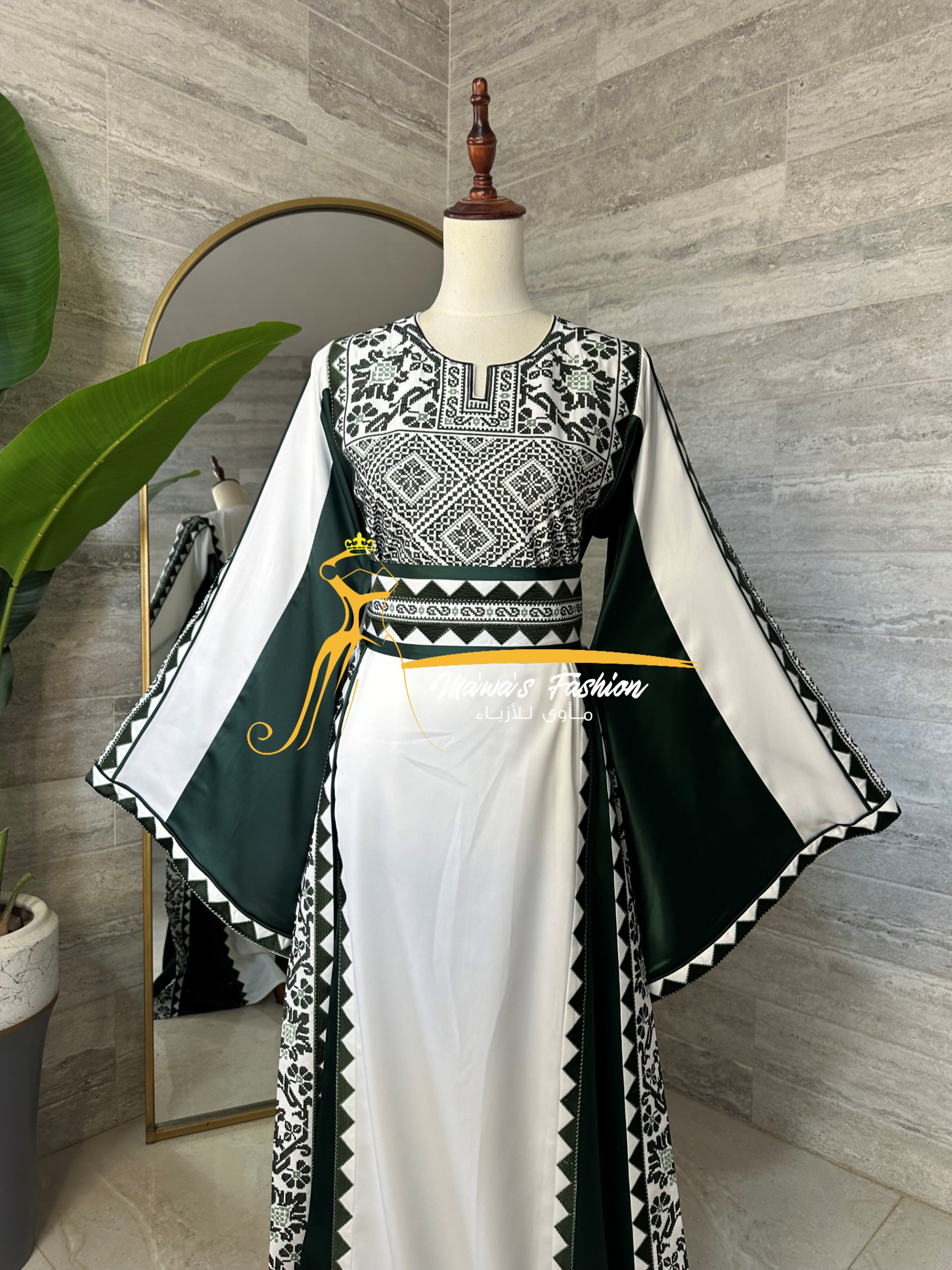 ثوب تراثي بلمسة عصرية مصنوع باللونين الابيض والاخضر الراقي مع تطريز تزيد الثوب بهجة، بقماشة الستان ليضيف على الثوب رقي.