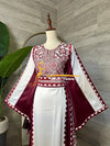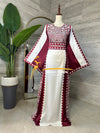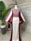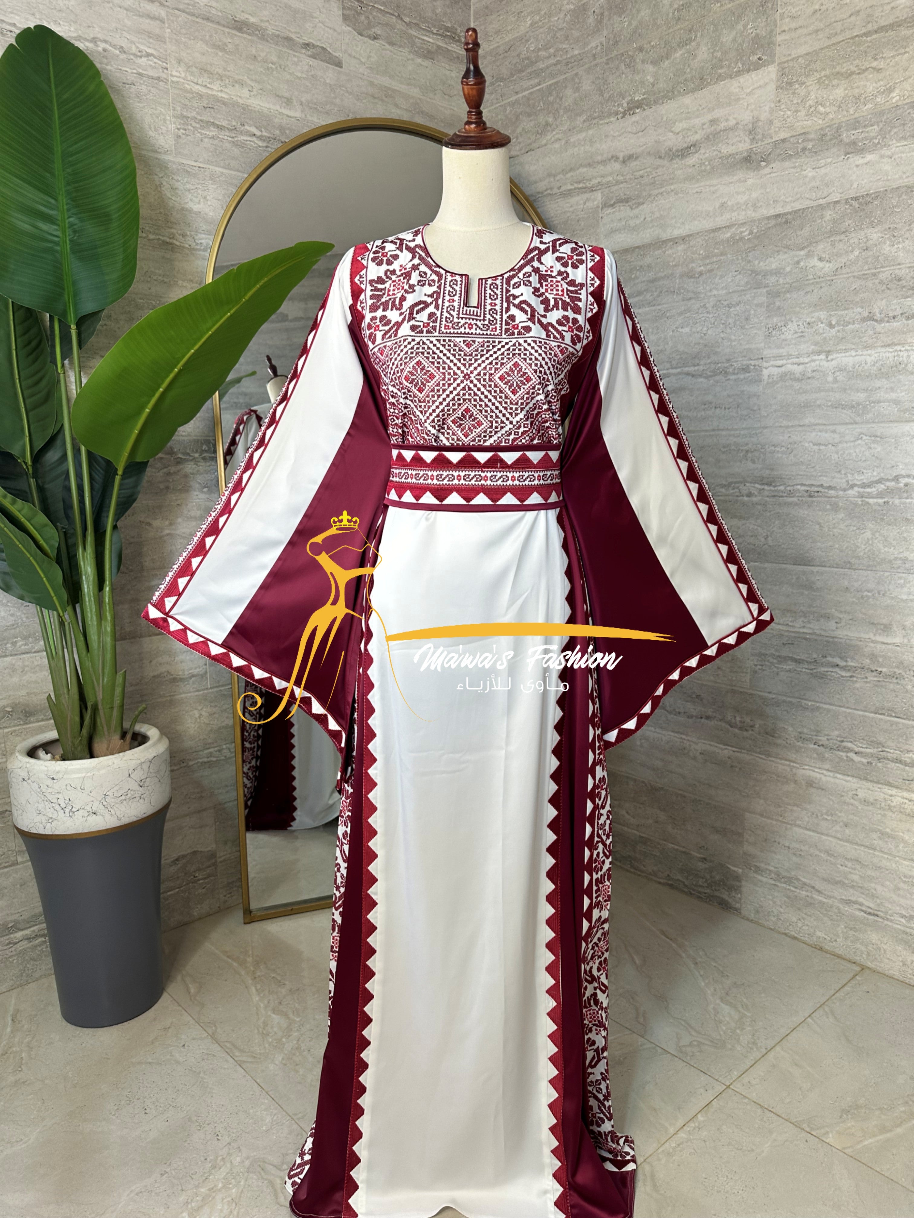 ثوب تراثي بلمسة عصرية مصنوع باللونين الابيض والاحمر الراقي مع تطريز تزيد الثوب بهجة، بقماشة الستان ليضيف على الثوب رقي.