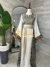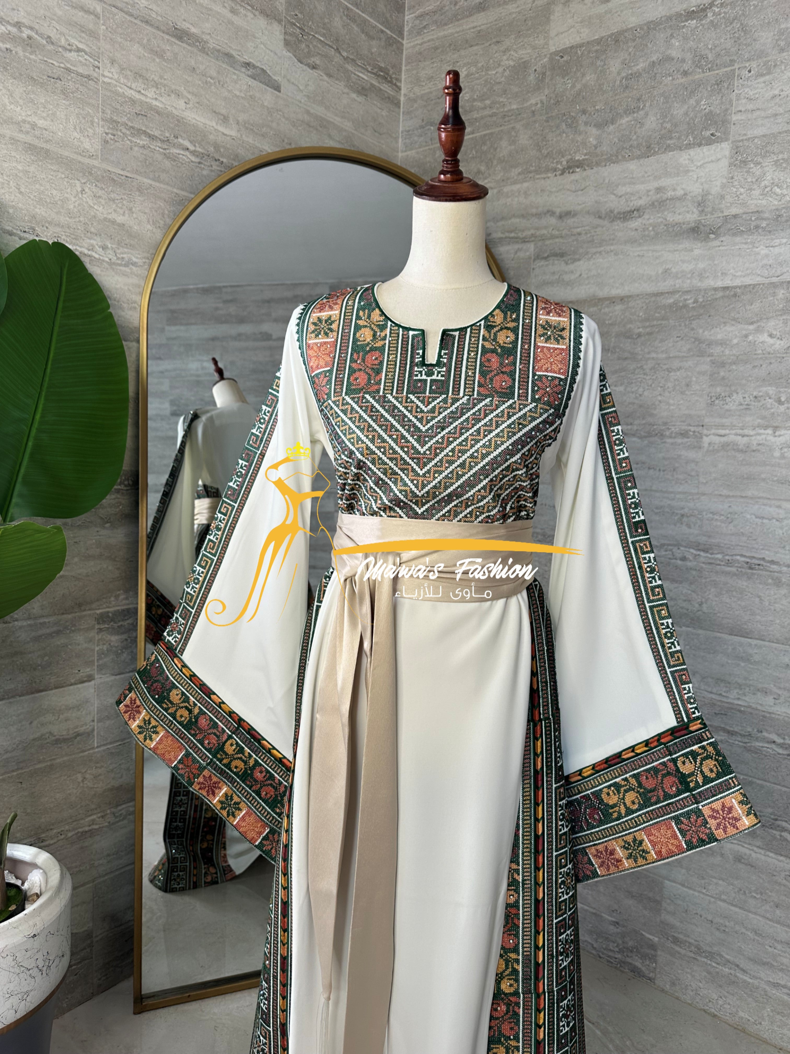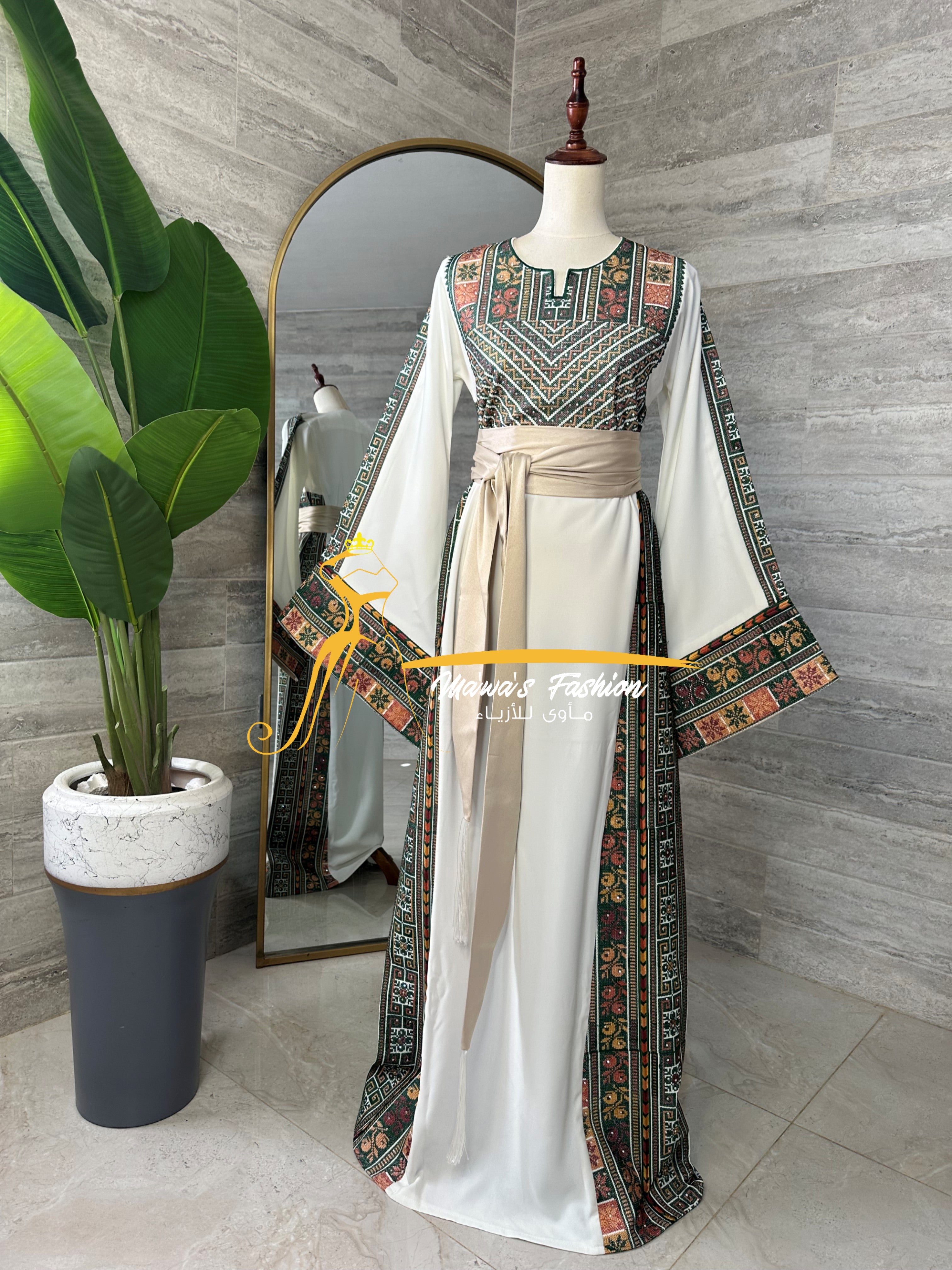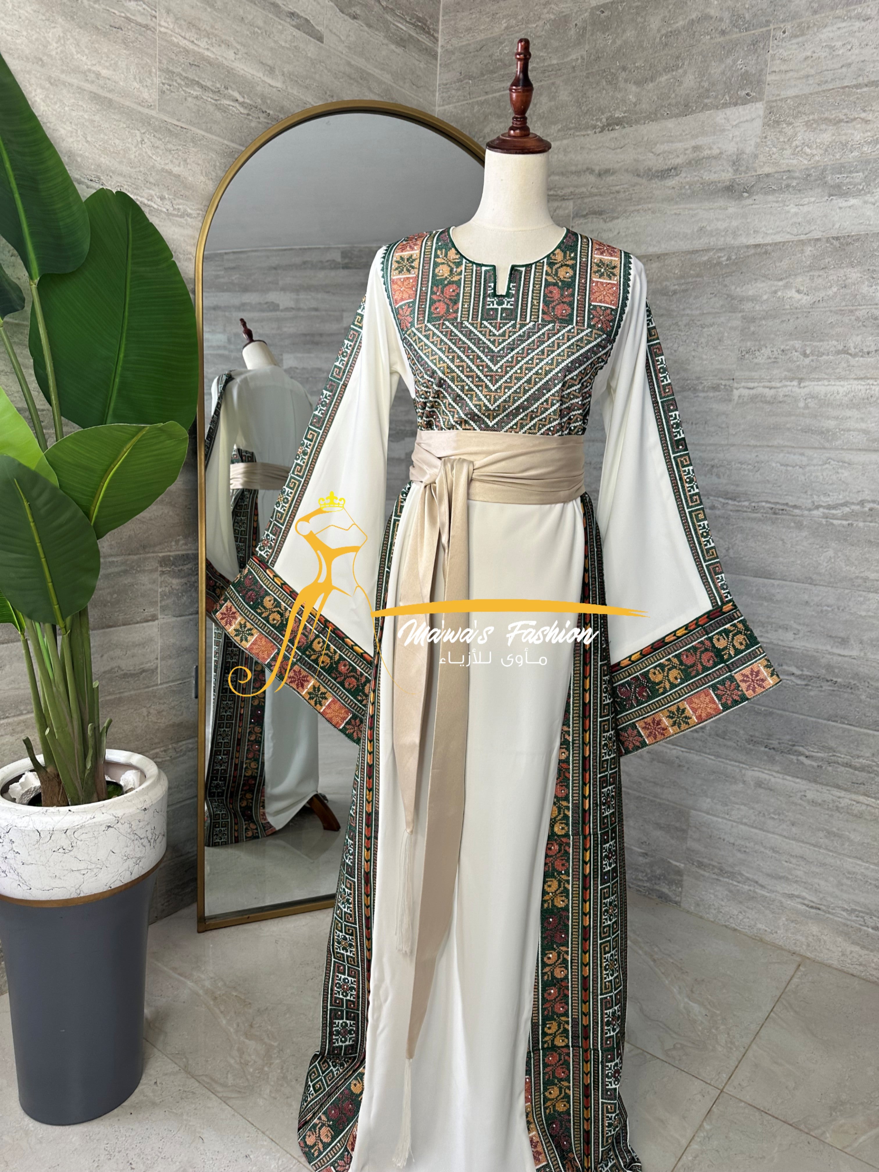 ثوب تراثي بلمسة عصرية بالوانه الراقية مع تطريز ثقيل بألوان رقيقة تزيد الثوب بهجة.