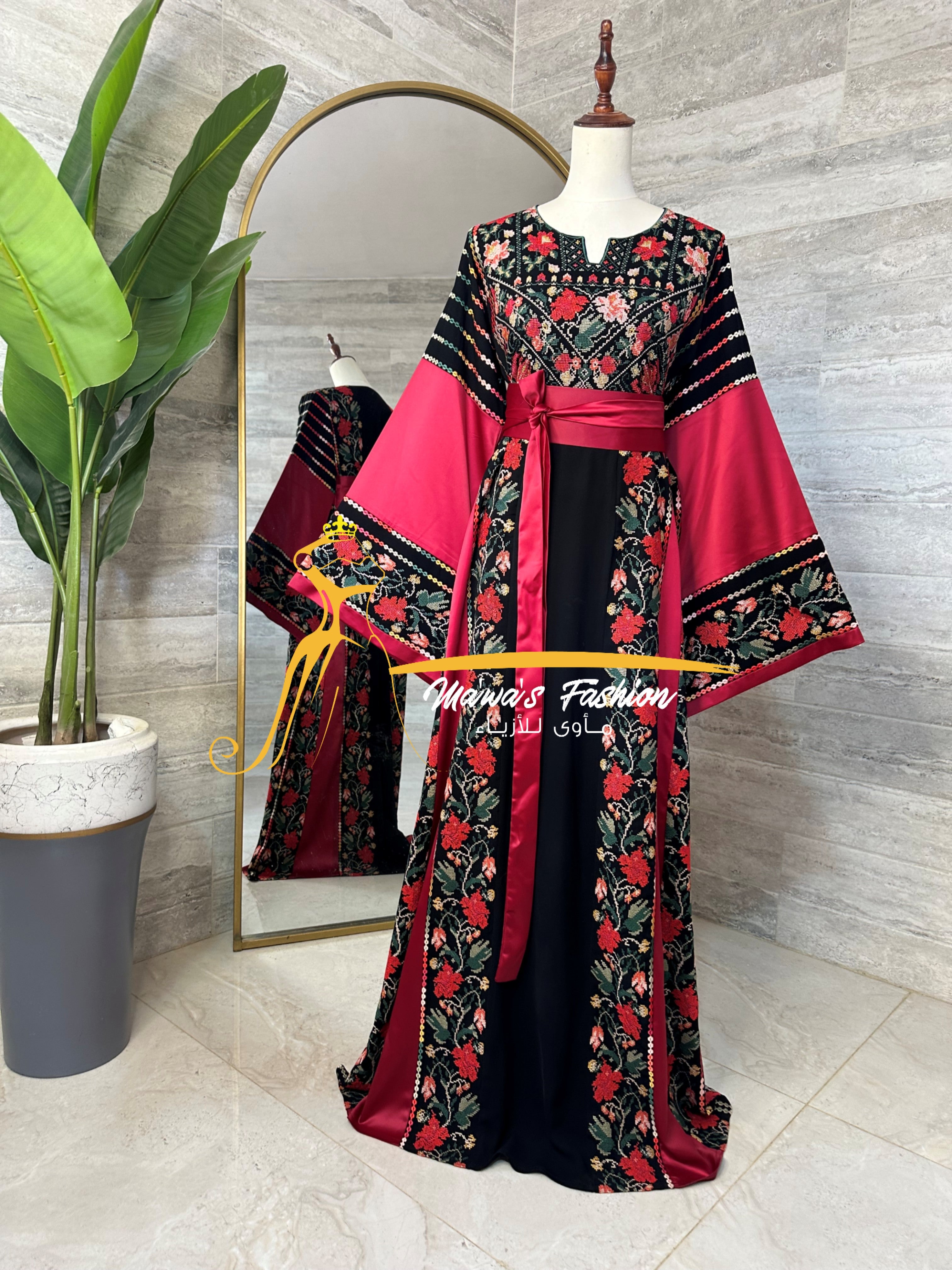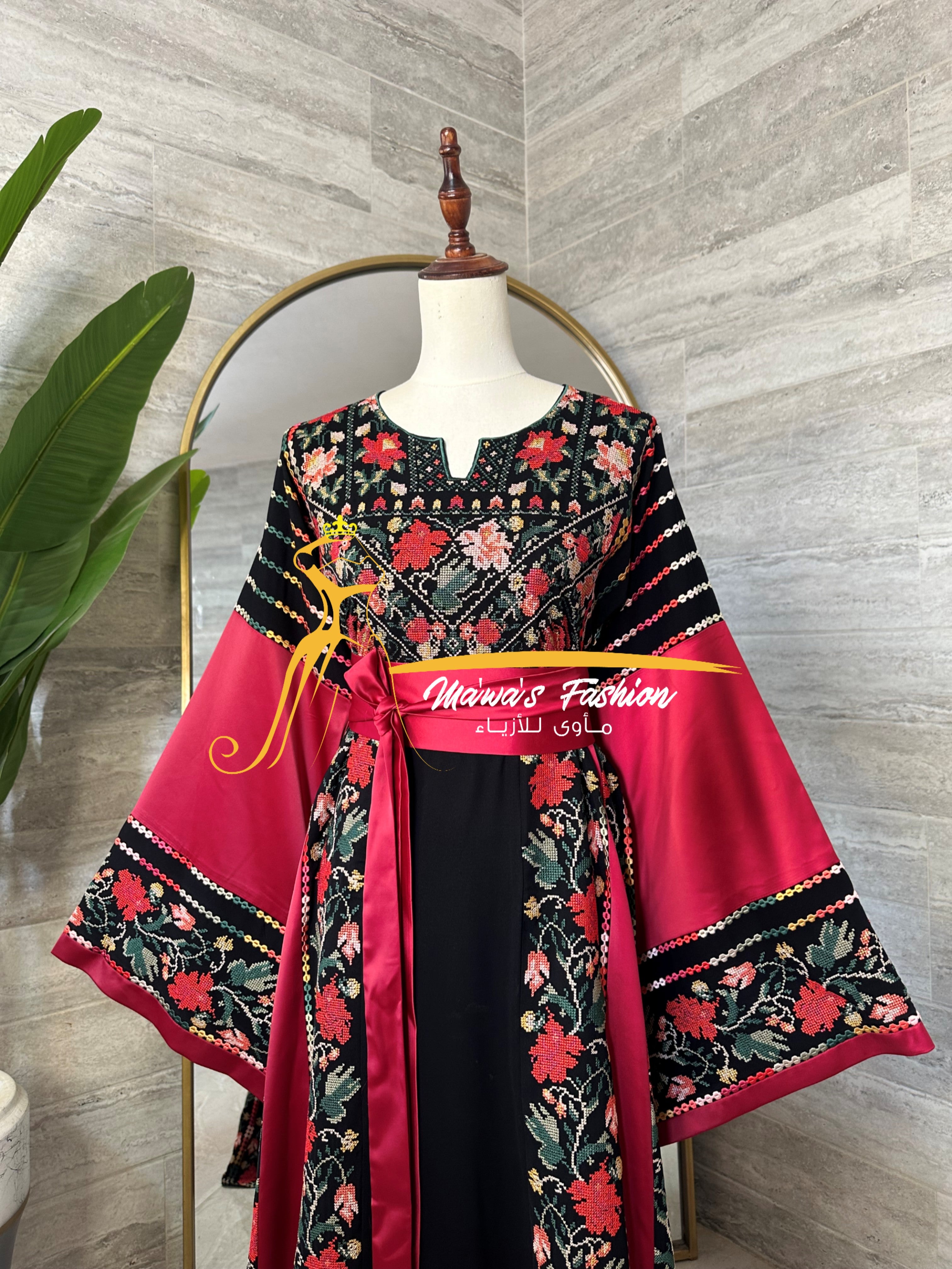 ثوب تراثي بلمسة عصرية باللون الاسود الراقي مع تطريز ثقيل من الأمام والخلف بألوان رقيقة تزيد الثوب بهجة، بالاضافة لقماشة الستان ليضيف على الثوب رقي.